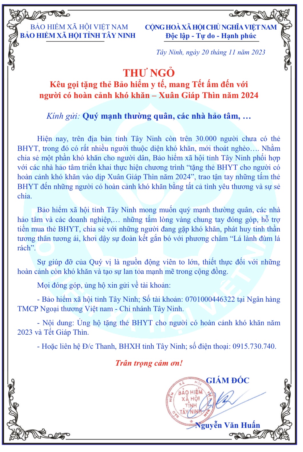 Bảo hiểm xã hội tỉnh Tây Ninh vừa có thư ngỏ kêu gọi tặng thẻ bảo hiểm y tế cho người dân có hoàn cảnh khó khăn nhân dịp Xuân Giáp Thìn năm 2024.