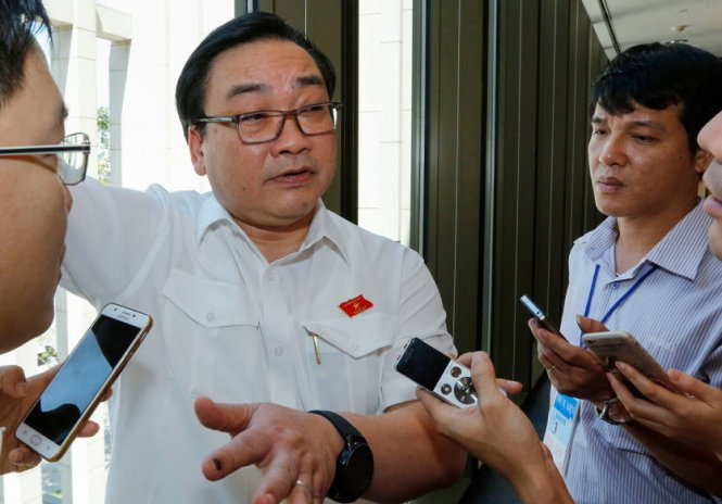 Bí thư Thành ủy Hà Nội Hoàng Trung Hải trả lời báo chí bên lề Quốc hội sáng 5-6 - Ảnh: Việt Dũng