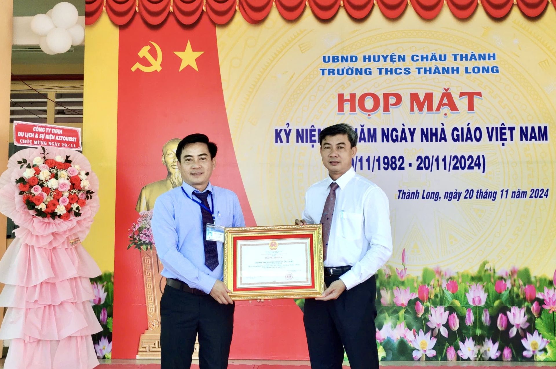 Tại buổi họp mặt, thừa uỷ quyền của UBND tỉnh, ông Trương Văn Hoàn – Bí thư Huyện uỷ Châu Thành trao Bằng khen của Chủ tịch UBND tỉnh cho tập thể Trường THCS Thành Long và hai cá nhân có thành tích 02 năm học liên tục (2022-2023 và 2023-2024) hoàn thành xuất sắc nhiệm vụ.