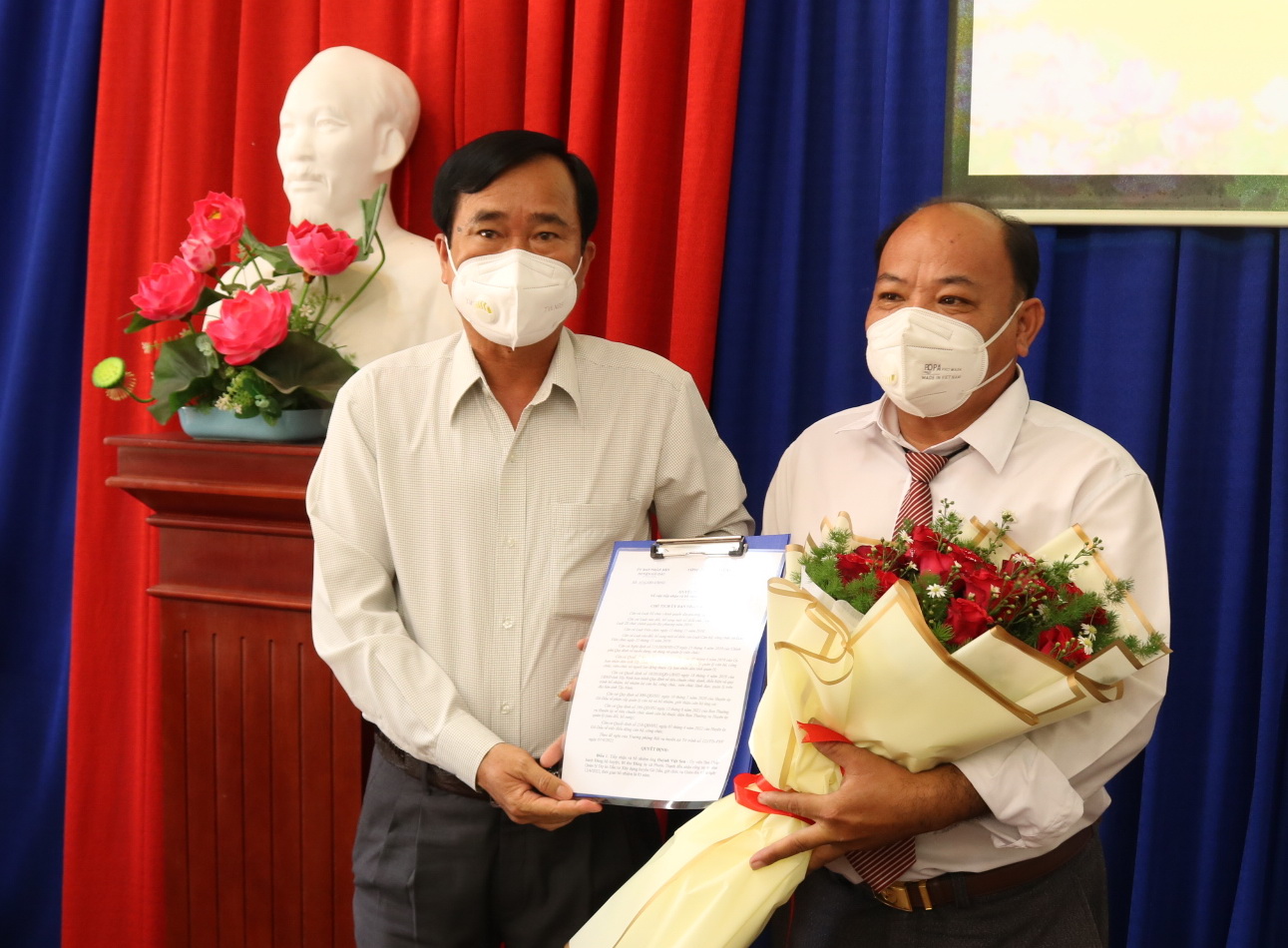 Ông Huỳnh Thanh Phương- Bí thư Huyện uỷ trao quyết định cho ông Đỗ Minh Tâm.