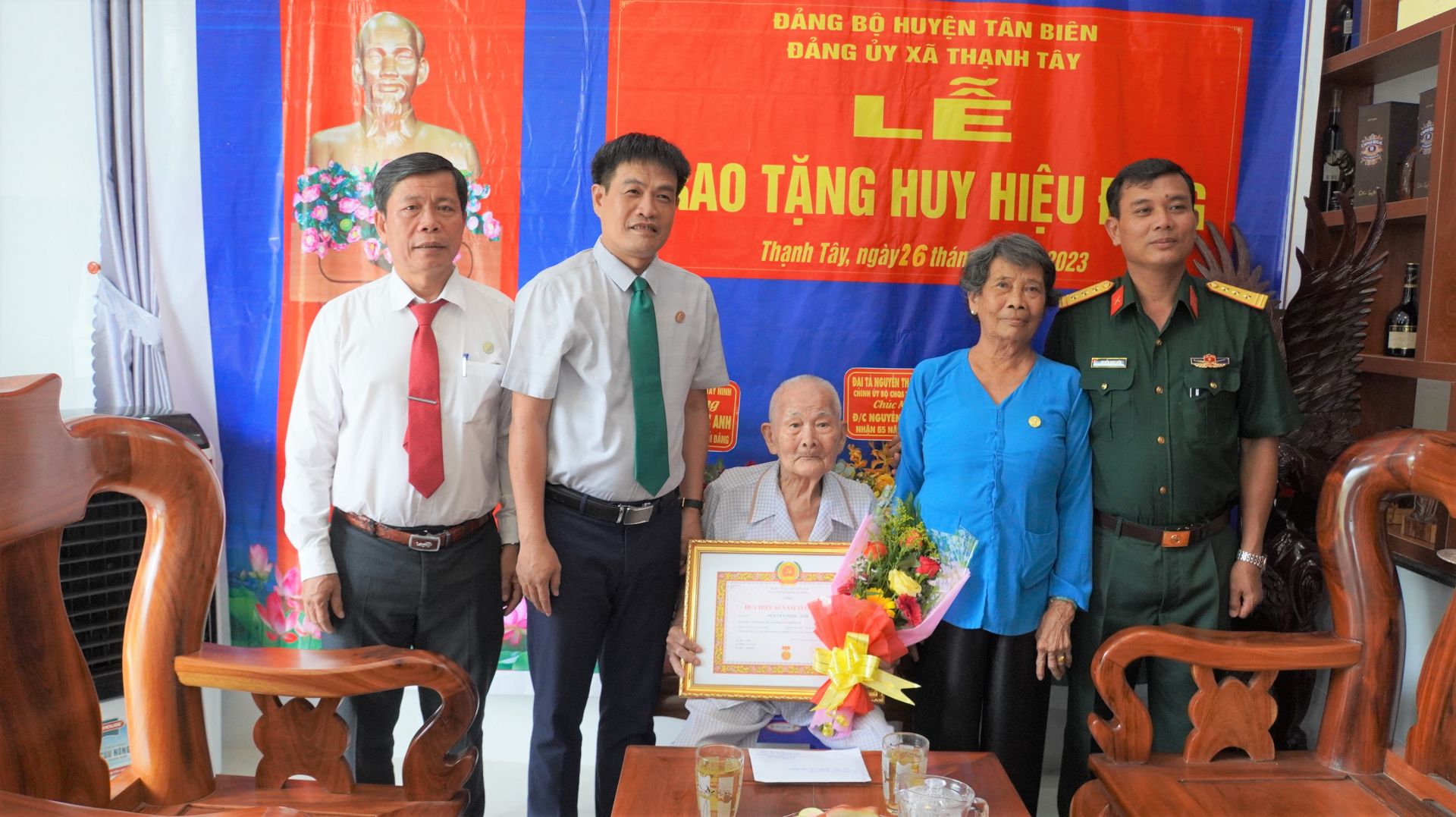 Huy hiệu 65 tuổi Đảng trao cho đảng viên Nguyễn Ngọc Anh, sinh ngày 11.11.1931, quê quán xã Xuân Sơn Bắc, huyện Đồng Xuân, tỉnh Phú Yên. Ông tham gia cách mạng từ năm 1947. Trải qua nhiều vị trí công tác trong quân đội và cơ quan nhà nước. Năm 1984, ông nghỉ hưu, hiện sinh hoạt Đảng tại Chi bộ ấp Thạnh Tây, Đảng bộ xã Thạnh Tây.