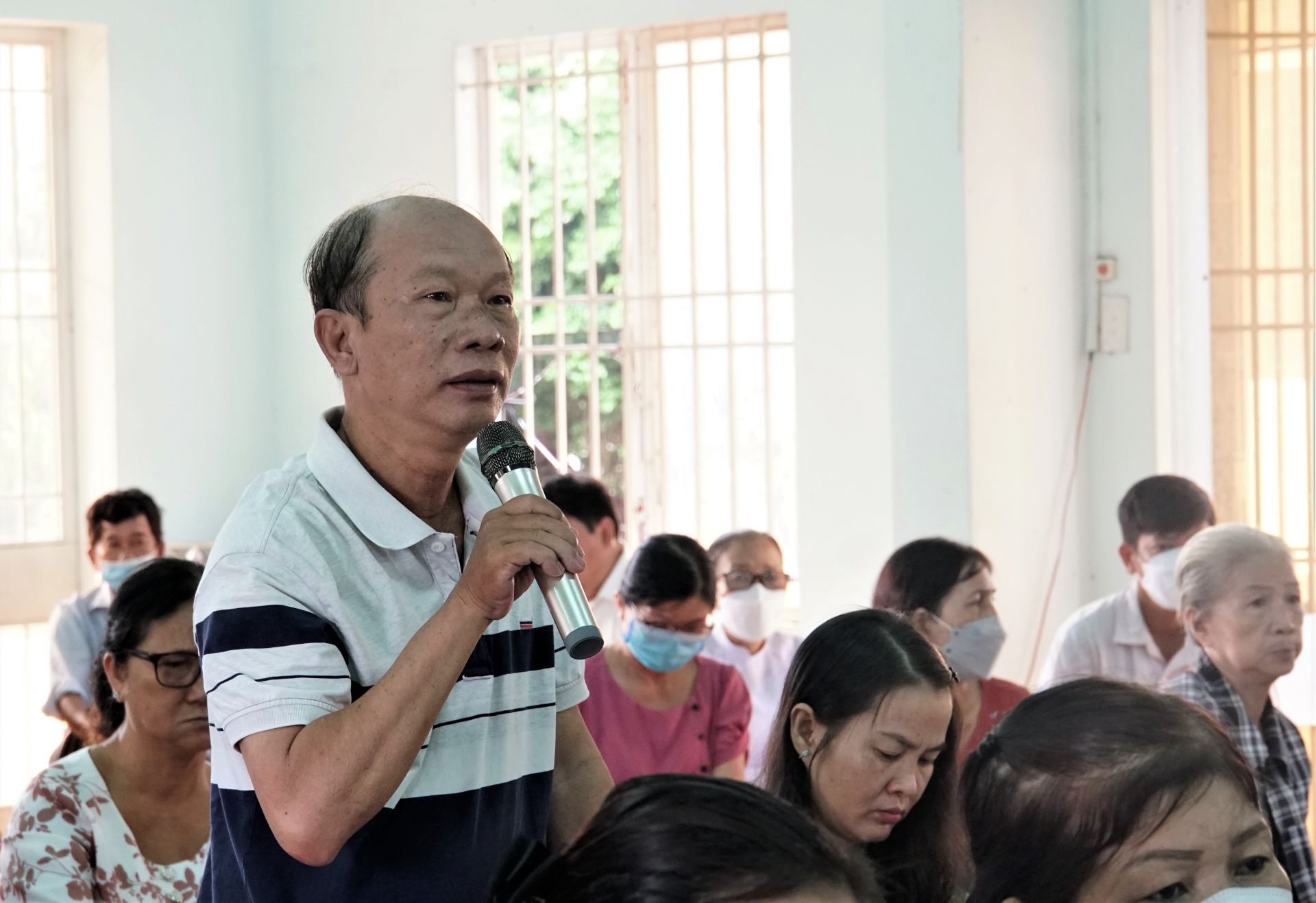 Cử tri phường Hiệp Ninh, thành phố Tây Ninh phát biểu ý kiến tại buổi tiếp xúc đại biểu HĐND hai cấp.
