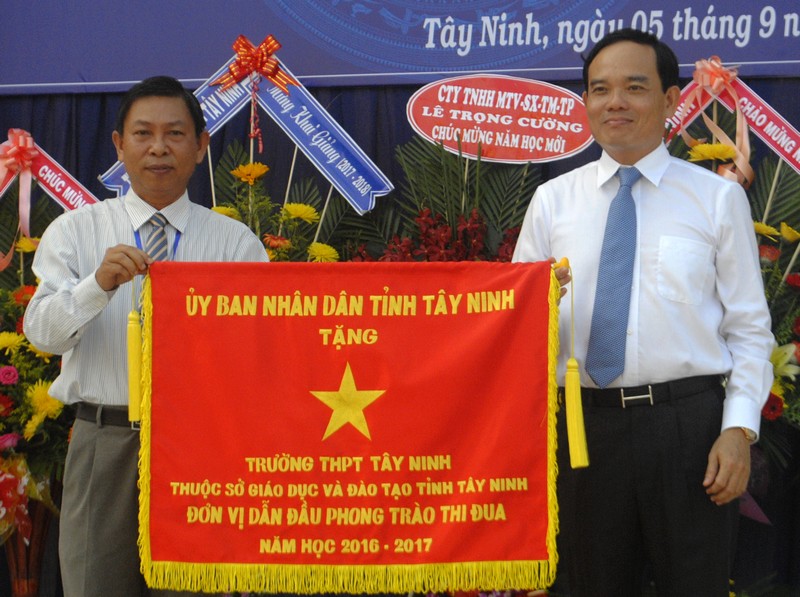 | Bí thư Tỉnh uỷ Trần Lưu Quang (phải) trao cờ thi đua cho Trường THPT Tây Ninh. |