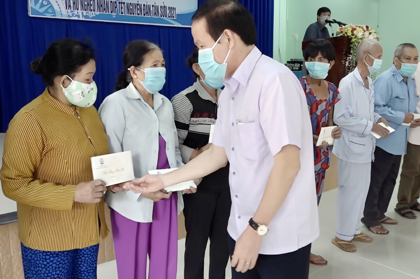 200 phần quà tết, mỗi phần là tiền mặt trị giá 1 triệu đồng được ông Lê Tiến Châu và ông Phạm Hùng Thái cùng lãnh đạo huyện Châu Thành trao tặng các gia đình chính sách và hộ nghèo xã Long Vĩnh.