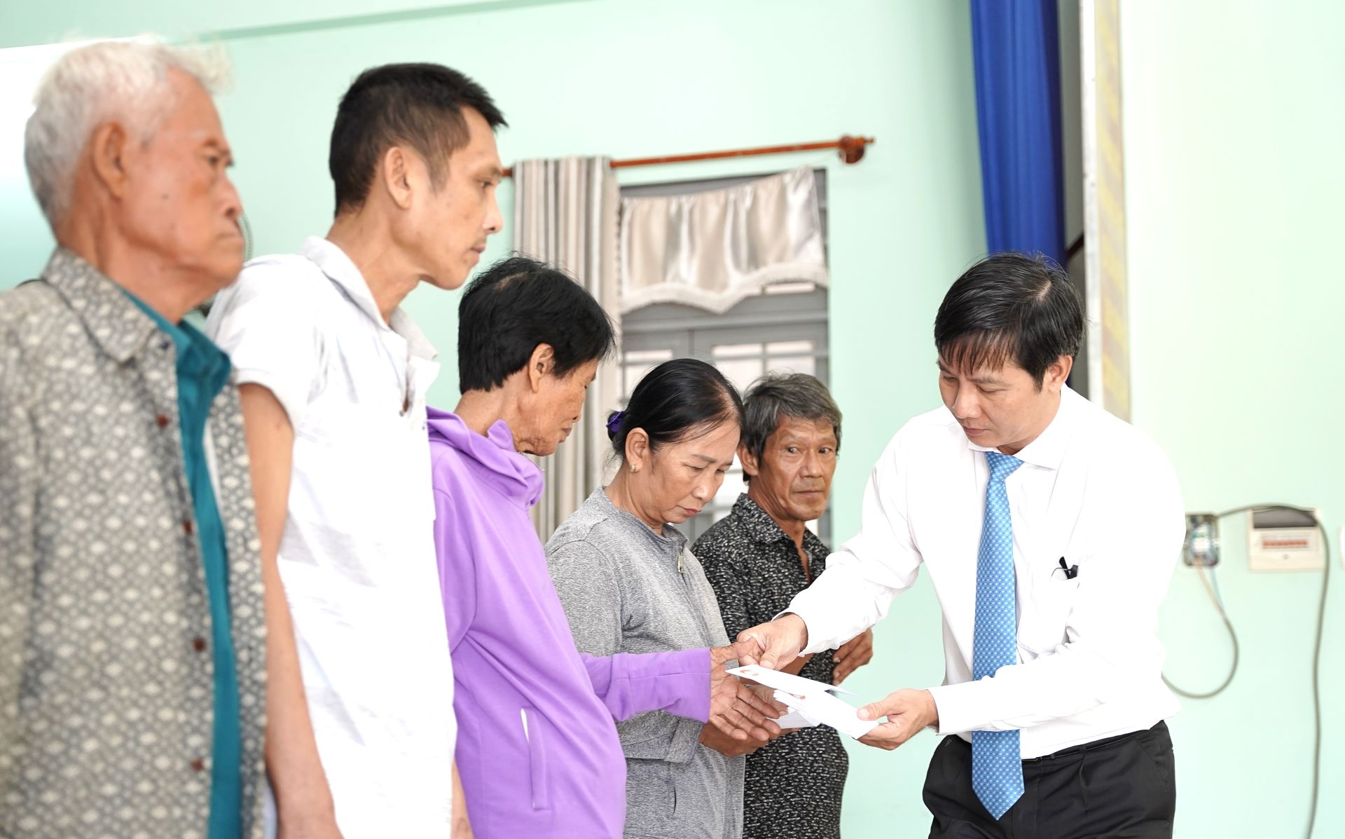 Lãnh đạo huyện Châu Thành trao quà cho hộ nghèo, hộ có hoàn cảnh khó khăn trên địa bàn xã Long Vĩnh.