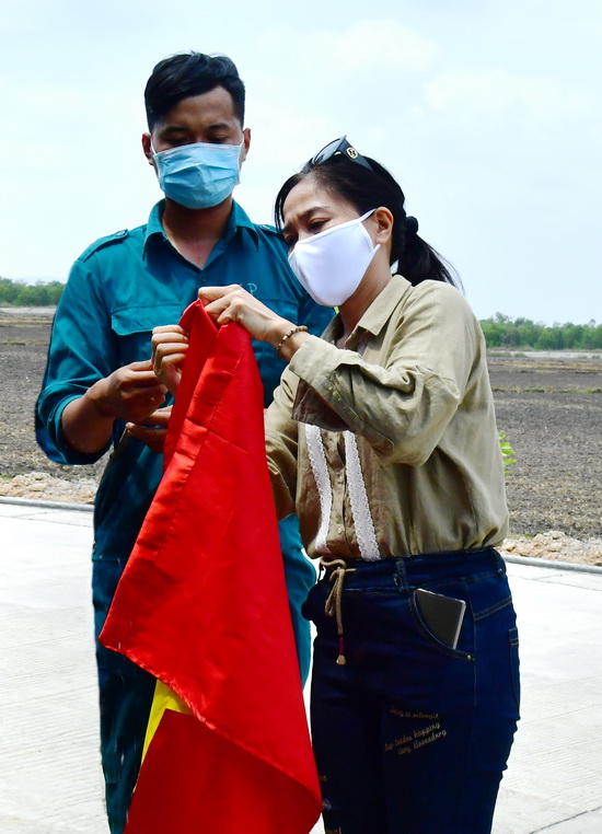 Bà Huỳnh Thanh Nam - Phó Tổng Biên tập Phụ trách Báo Tây Ninh cùng các chiến sĩ Đồn BP Phước Chỉ treo cờ Tổ quốc.
