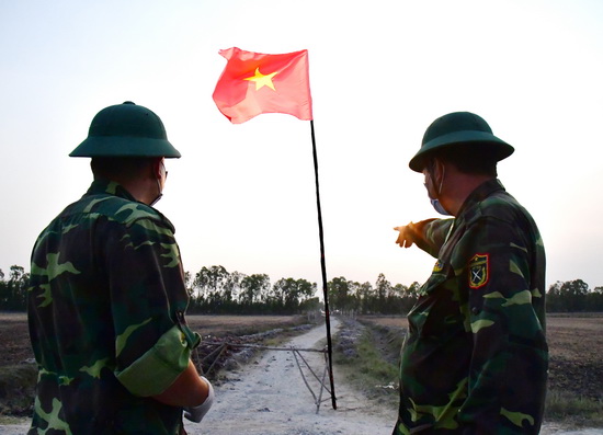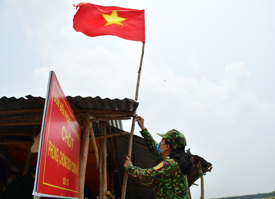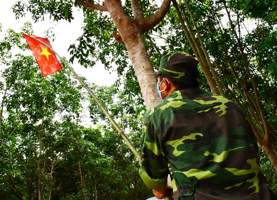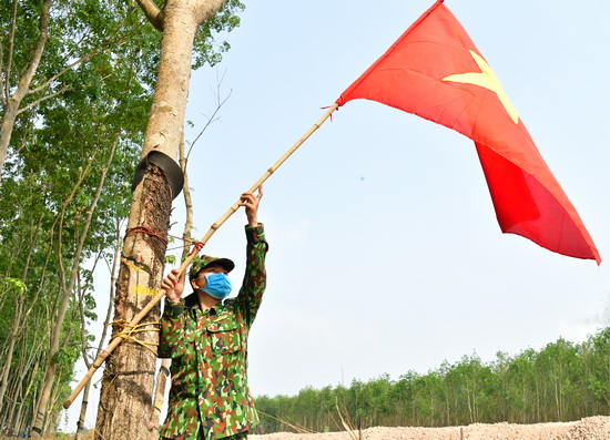 Cờ tổ quốc được các chiến sĩ tại điểm chốt 172 Mộc Bài cắm xuống vị trí đóng quân canh phòng.