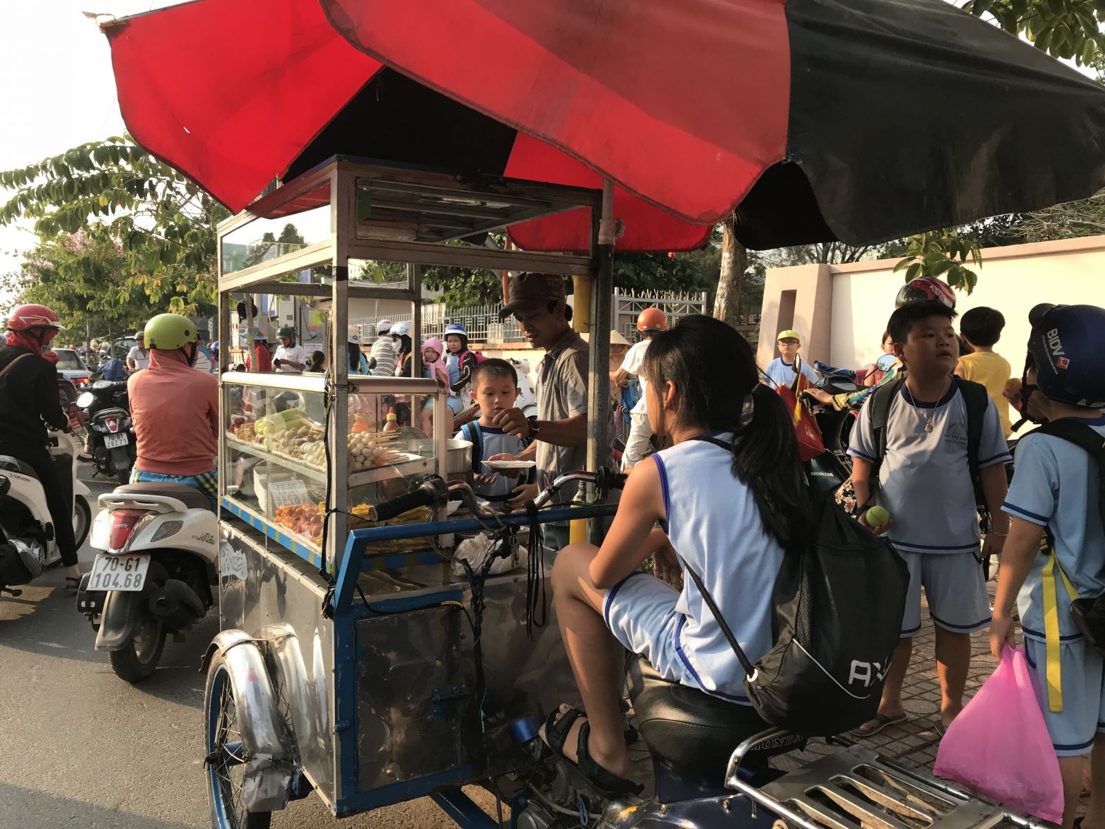 Tại một số trường tiểu học trên địa bàn thành phố Tây Ninh như Võ Thị Sáu, Trần Phú, Tôn Thất Tùng… xe hàng rong dàn hàng trước cổng, bày bán đủ thứ, từ các món ăn vặt như bánh tráng trộn, bánh tráng nướng… đến các thức uống như trà sữa, trà chanh. Với mức giá hợp túi tiền, hình thức bắt mắt và hương vị hấp dẫn, những món ăn, thức uống này rất thu hút các em học sinh.