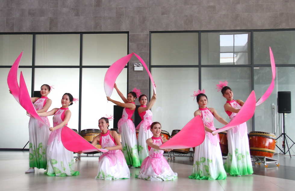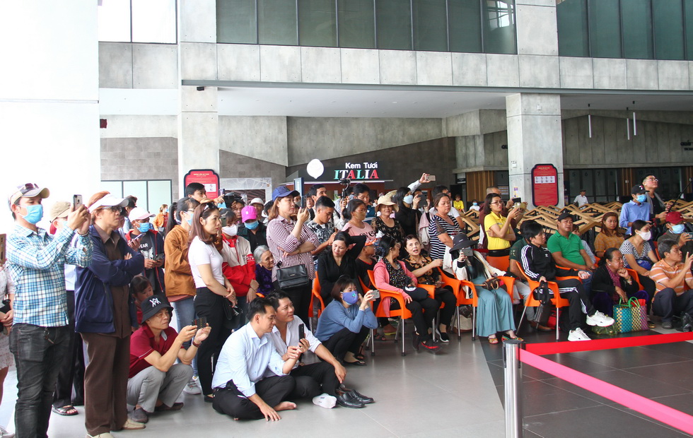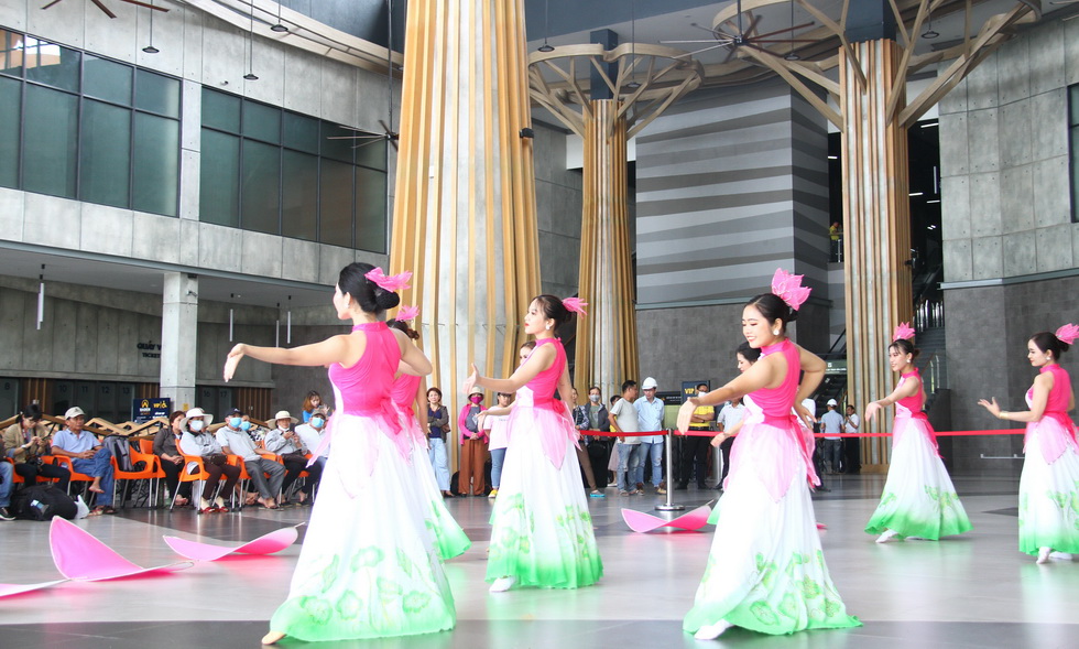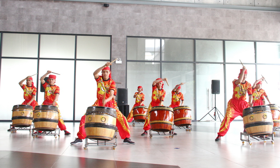 Tiếng trống hội cùng với đội biểu diễn trống bên trong nhà ga Bà Đen ở dưới chân núi.
