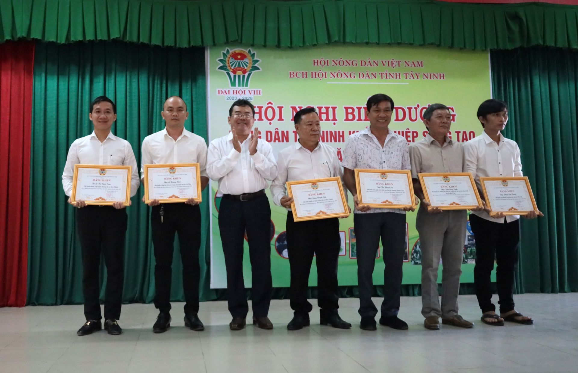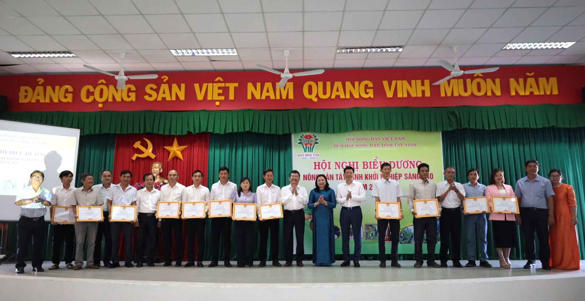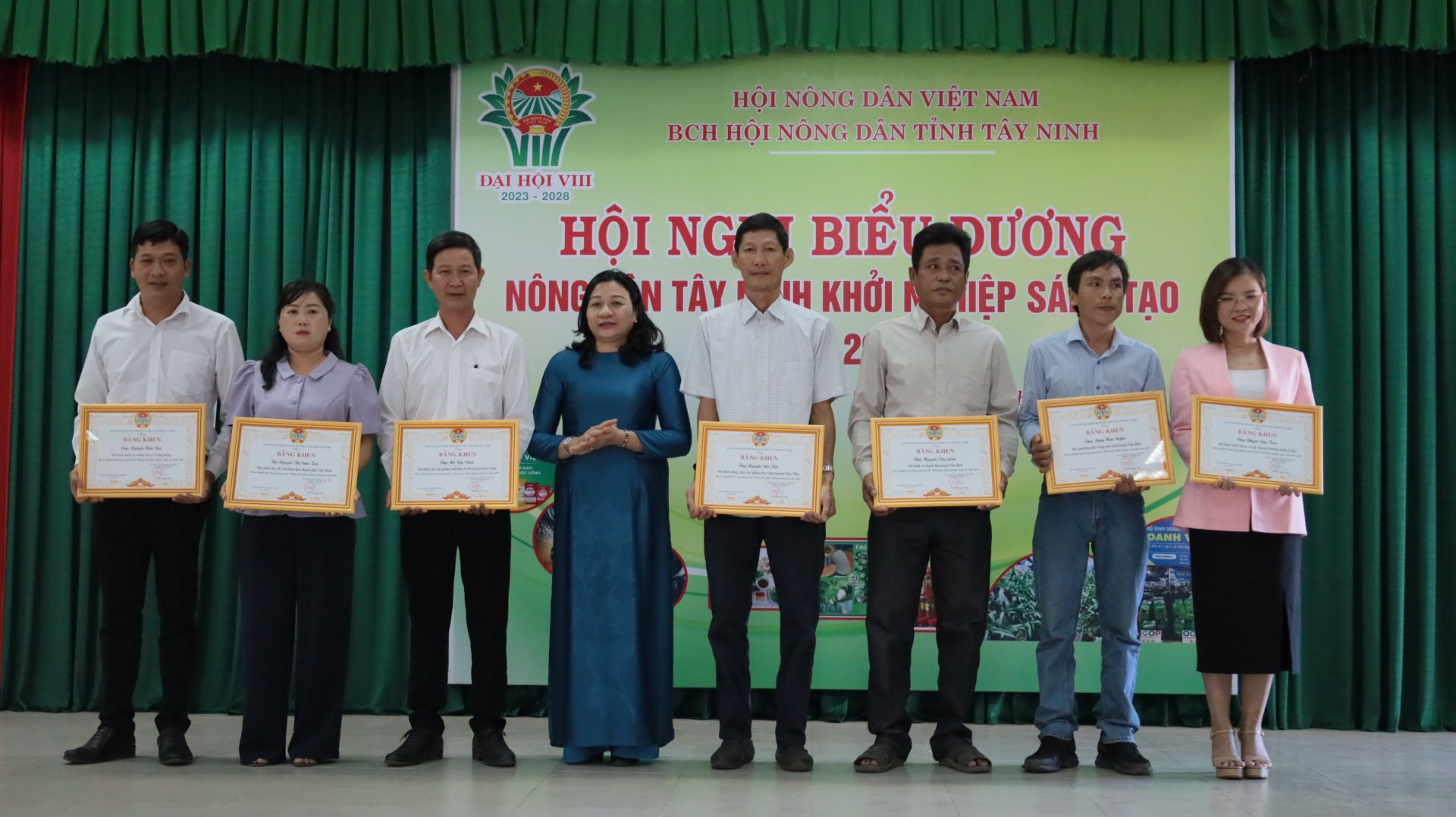 Bà Lê Thị Ngọc Yến - Chủ tịch Hội Nông dân tỉnh Tây Ninh trao bằng khen biểu dương nông dân tiêu biểu.