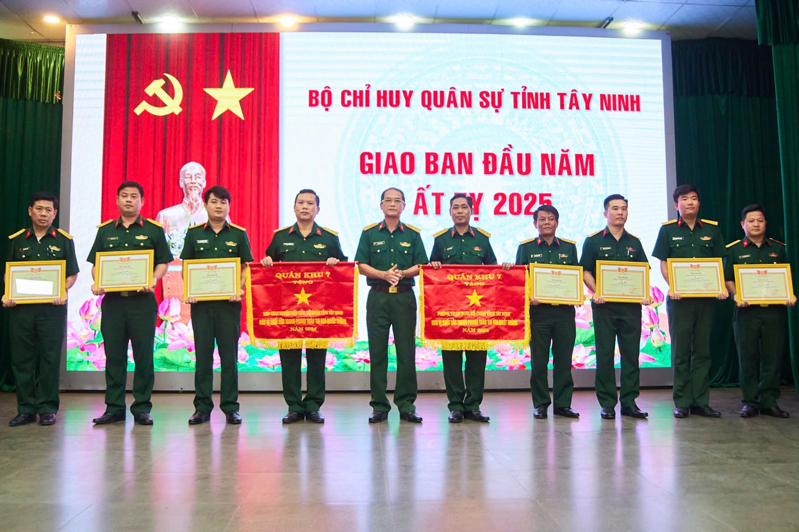 Dịp này, Bộ CHQS tỉnh đã trao cờ thi đua và bằng khen của Quân khu cho các tập thể, cá nhân có thành tích xuất sắc trong Phong trào thi đua quyết thắng năm 2024 và giấy khen của Bộ CHQS tỉnh cho tập thể, cá nhân có thành tích tiêu biểu trong đợt thi đua cao điểm “Mừng Đảng, mừng Xuân, ra quân Quyết thắng”.