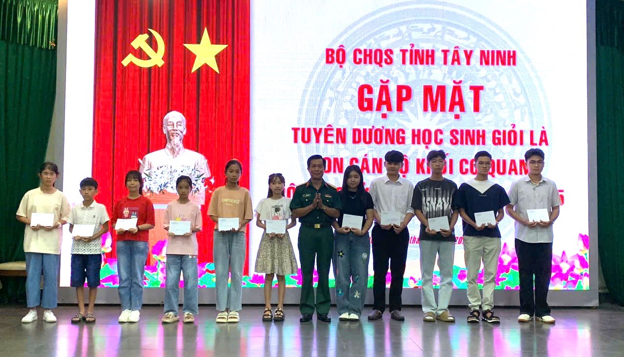 Sáng 11.6, Bộ Chỉ huy Quân sự (CHQS) tỉnh Tây Ninh tổ chức gặp mặt, tuyên dương học sinh là con của sĩ quan, quân nhân chuyên nghiệp (QNCN) khối cơ quan, đơn vị trực thuộc Bộ CHQS tỉnh đạt thành tích xuất sắc trong học tập và rèn luyện năm 2025. Đại tá Trần Quốc Hưng– Phó Chủ nhiệm Chính trị Bộ CHQS tỉnh dự và trao quà tặng các em.