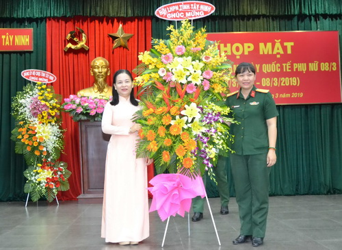 Bà Võ Thị Bạch Tuyết- Chủ tịch Hội LHPN tỉnh Tây Ninh tặng lẵng hoa chúc mừng phụ nữ Bộ CHQS tỉnh.