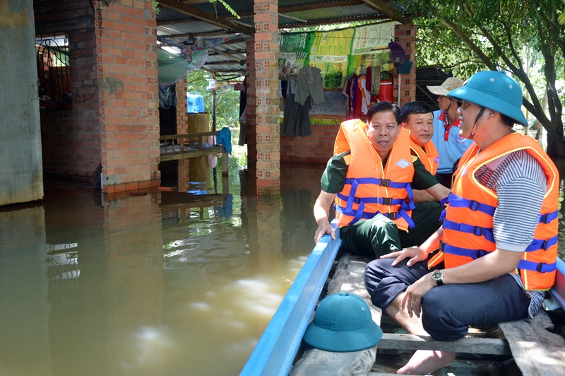 | Đại tá Lê Văn Nhân- Chủ nhiệm Chính trị Bộ CHQS tỉnh tìm hiểu tình hình ngập lụt ở ấp Rạch Tre, xã Biên Giới. |