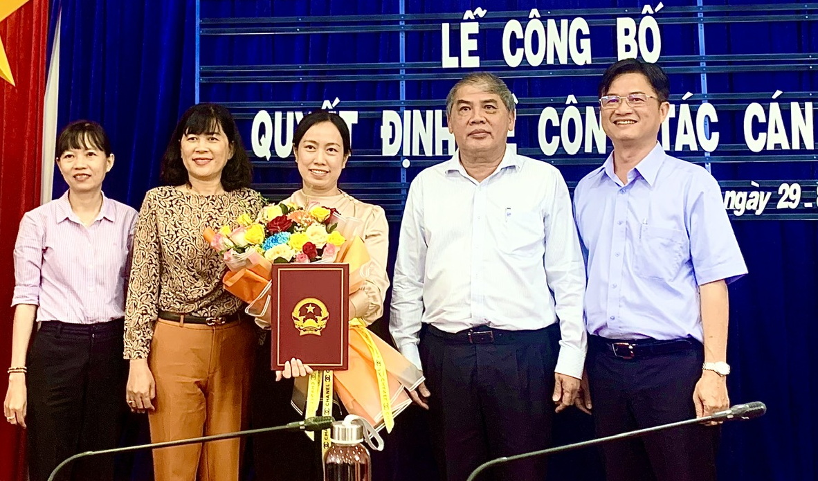 Bà Nguyễn Đài Thy và ông Nguyễn Thanh Phong – Phó Chủ tịch HĐND tỉnh trao quyết định và chúc mừng bà Nguyễn Thị Thu Hương.