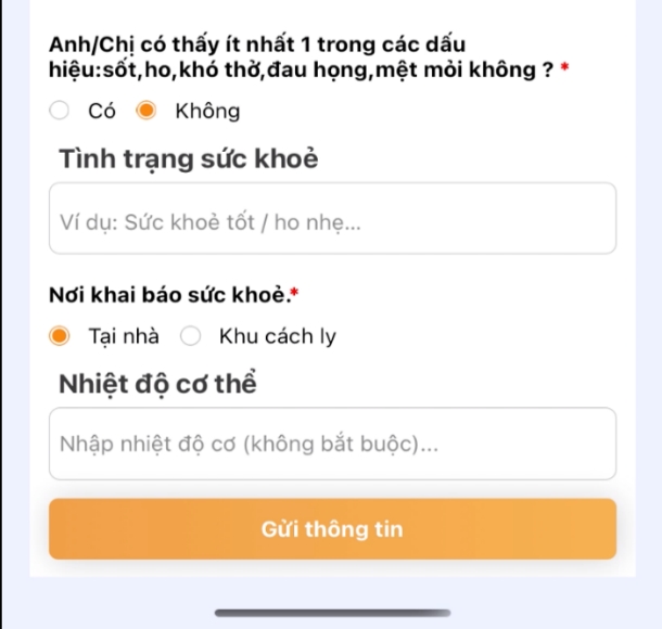 + Đối với người tự cách ly tại nhà: Nơi khai báo sức khoẻ chọn "Tại nhà". Trường hợp có thể tự đo nhiệt độ tại nhà thì nhập nhiệt độ vào mục "Nhiệt độ cơ thể".