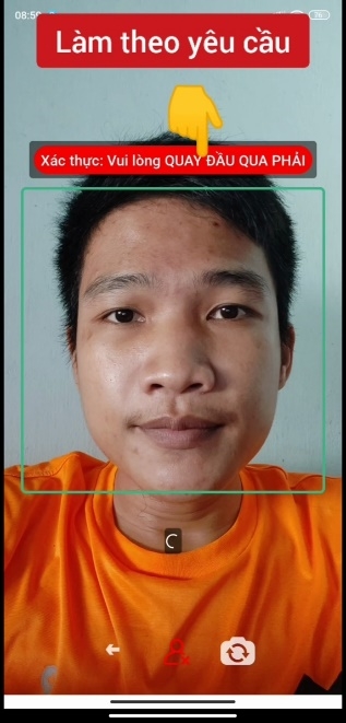 Thực hiện xác thực khuôn mặt bằng cách đưa khuôn mặt vào khung xanh trên màn hình và thực hiện theo các chỉ dẫn như nhắm mắt, xoay sang trái, xoay sang phải. Sau khi thực hiện thành công ứng dụng thông báo như hình dưới.