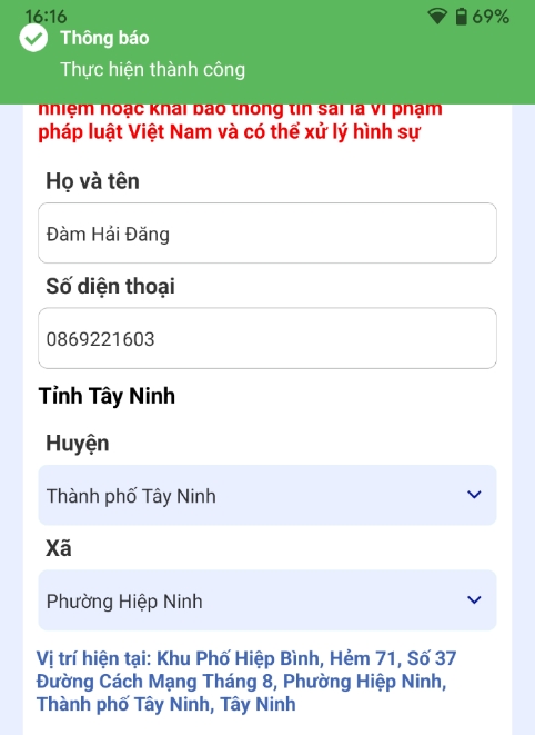 Chọn "Đồng ý cung cấp vị trí" khi được hỏi. Nhập đầy đủ thông tin cá nhân và tình trạng sức khoẻ theo yêu cầu như sau: