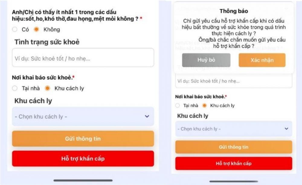 + Cách 1: Chọn vào nút "Hỗ trợ khẩn cấp" và bấm " Xác nhận" ở màn hình thông báo hiện lên để gửi yêu cầu hỗ trợ đến cho cán bộ y tế phụ trách.