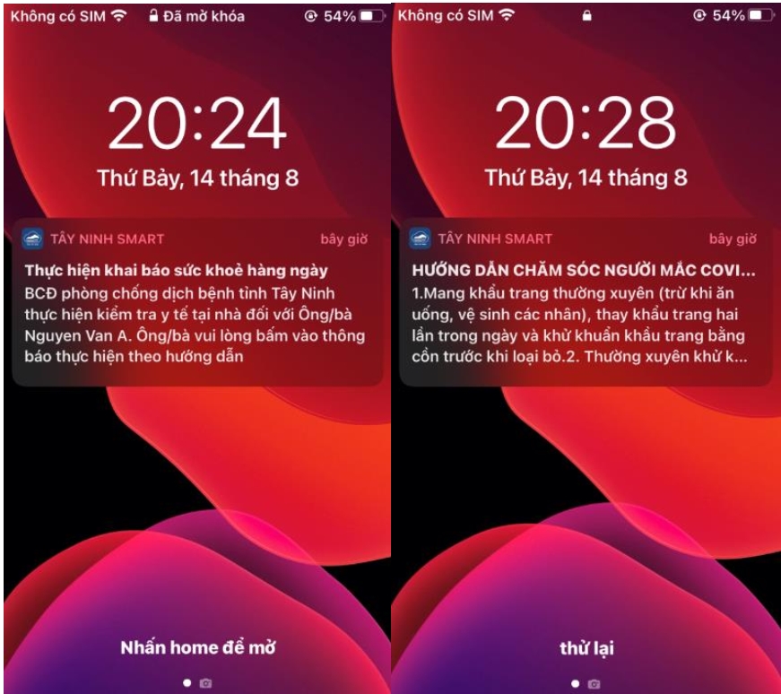 Hằng ngày, người cách ly tại nhà hoặc cách ly tập trung sẽ nhận được các thông báo nhắc nhở khai báo sức khoẻ, hướng dẫn thực hiện cách ly trên ứng dụng “Tây Ninh Smart” như sau: