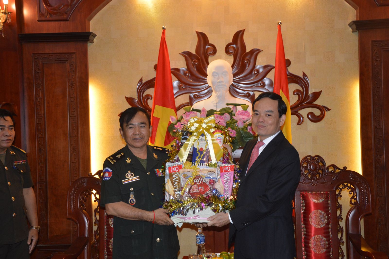 | Trung tướng Ton Nhien- Chỉ huy trưởng Tiểu khu quân sự Oddar Meanchey tặng quà chúc tết Bí thư Tỉnh ủy Trần Lưu Quang. |