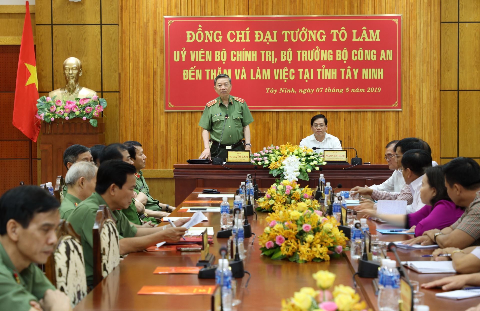 Bộ trưởng Tô Lâm yêu cầu Công an tỉnh triển khai đồng bộ các biện pháp nghiệp vụ bảo đảm tình hình an ninh, trật tự, phục vụ đắc lực nhiệm vụ phát triển kinh tế - xã hội của địa phương, tạo môi trường thuận lợi để thu hút các nhà đầu tư trong và ngoài nước đến với Tây Ninh, bảo đảm cuộc sống bình yên cho nhân dân.