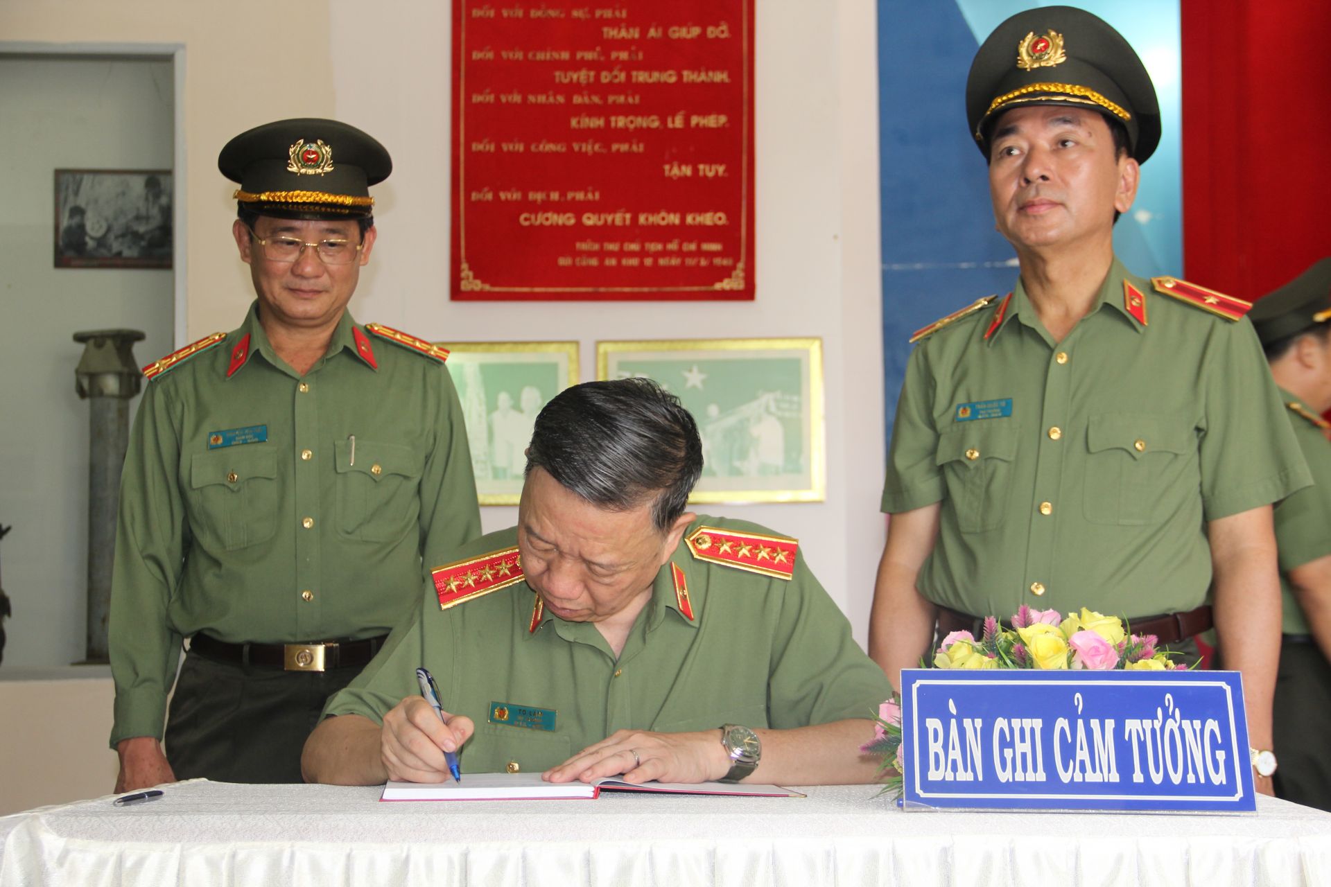 Bộ trưởng Bộ Công an Tô Lâm viết lưu bút tại Bảo tàng CAND chi nhánh Tây Ninh.
