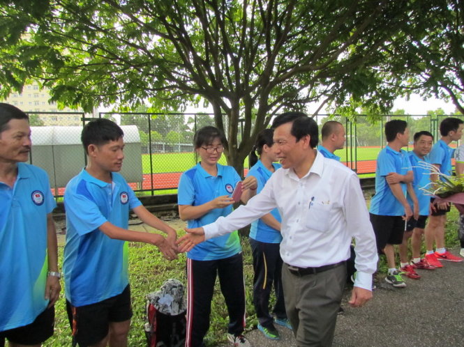 Bộ trưởng Bộ VH-TT&DL Nguyễn Ngọc Thiện bắt tay động viên HLV, VĐV. Ảnh: PHƯƠNG THẢO