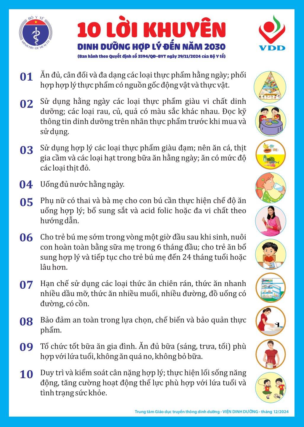 Theo quyết định, “Mười lời khuyên dinh dưỡng hợp lý đến năm 2030” là cơ sở để các đơn vị trong ngành y tế phục vụ cho công tác truyền thông, giáo dục dinh dưỡng nhằm nâng cao kiến thức và thực hành dinh dưỡng hợp lý trong Nhân dân.