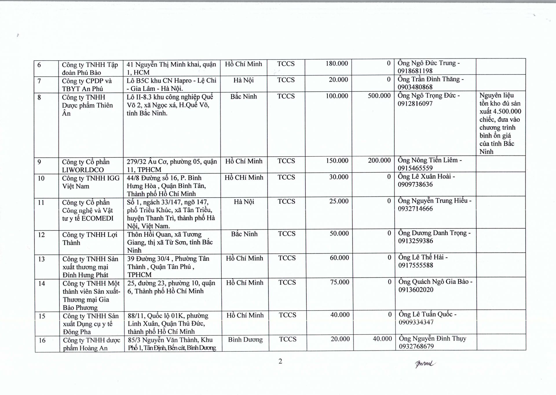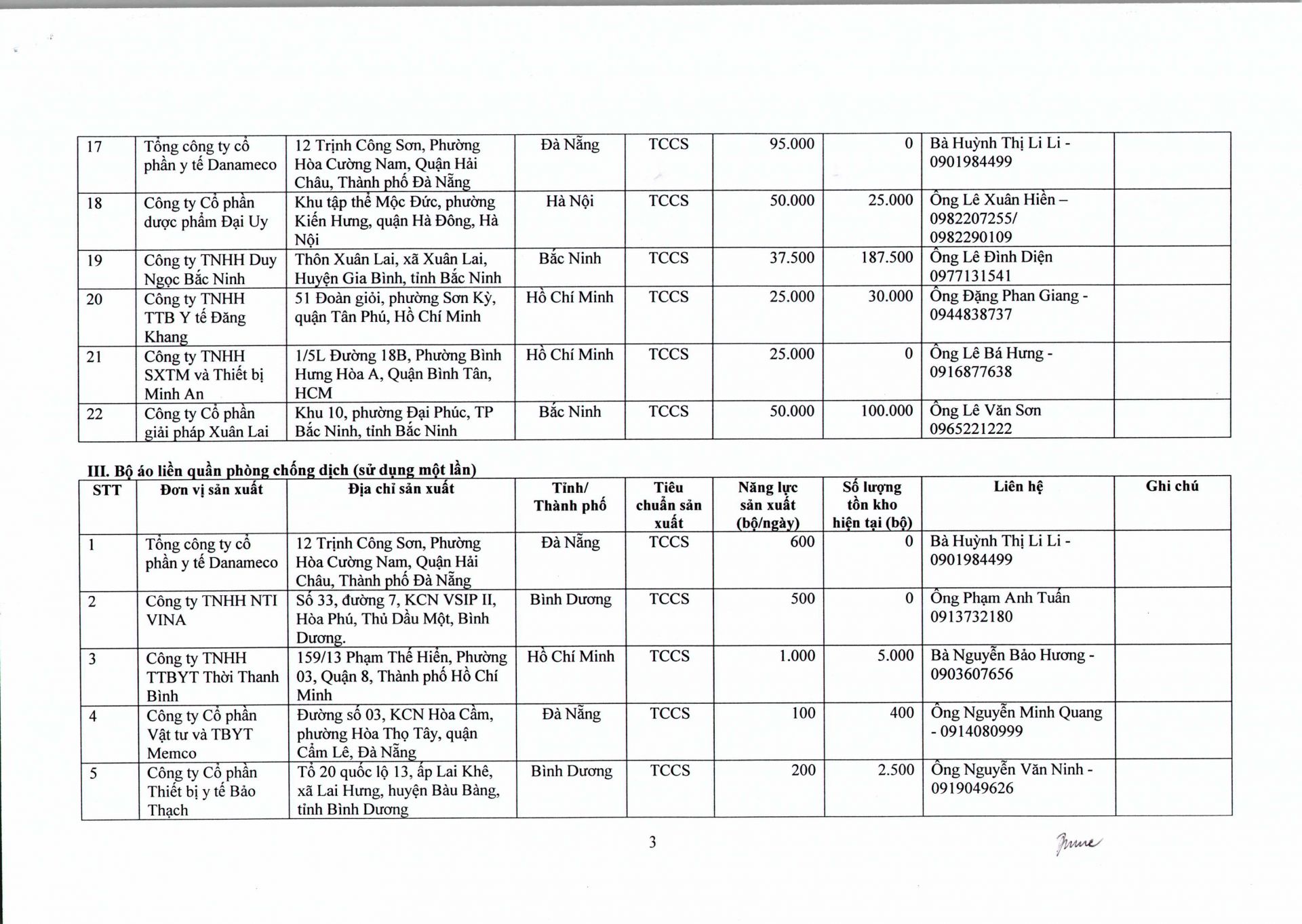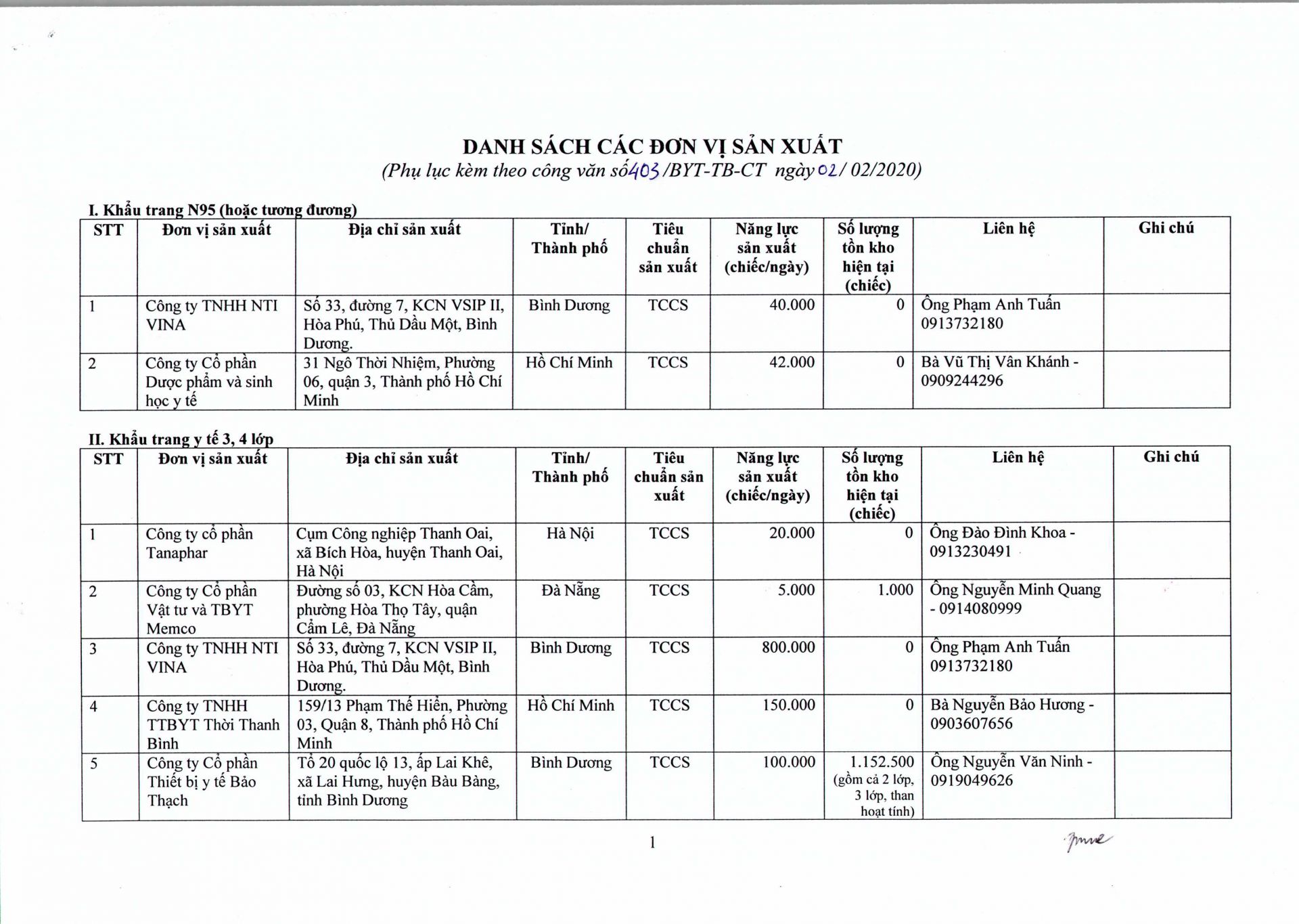 Trước tình hình diễn biến mới của dịch nCoV gây ra tại Việt Nam, để không thiếu khẩu trang y tế và trang phục phòng, chống dịch bệnh, căn cứ số liệu theo dõi, nắm bắt và báo cáo của các đơn vị sản xuất trong nước, Bộ Y tế thông báo nhanh danh sách 33 đơn vị sản xuất khẩu trang y tế và trang phục phòng, chống dịch để các đơn vị chủ động liên hệ, có kế hoạch trang bị phòng, chống dịch bệnh theo chỉ đạo của Chính phủ và hướng dẫn của Bộ Y tế.