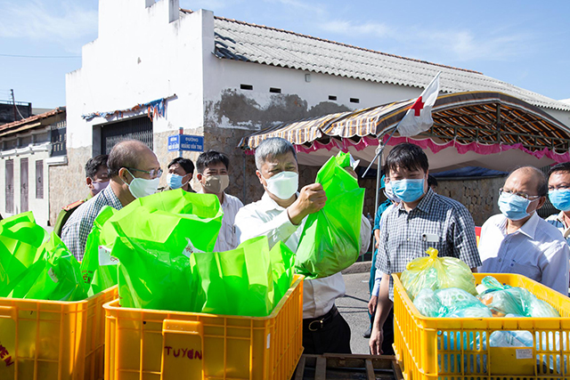 Thứ trưởng Nguyễn Trường Sơn kiểm tra một số hàng hóa, thực phẩm được chuẩn bị cấp phát cho nhân dân ở hai bên tuyến đường thuộc khu phố 2, phường Đức Thắng, TP Phan Thiết bị cách ly để phòng, chống dịch Covid-19.