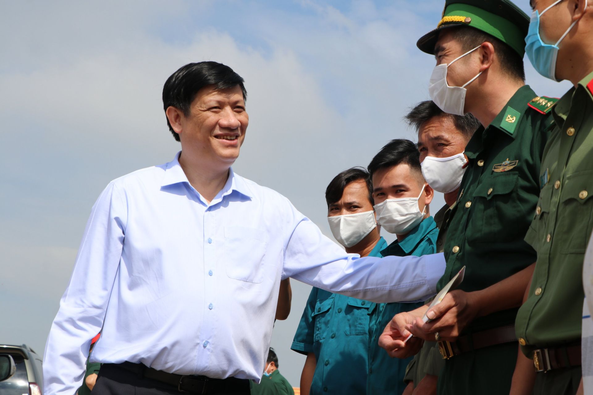 Bộ trưởng Bộ Y tế Nguyễn Thanh Long động viên tinh thần các chiến sĩ làm nhiệm vụ chốt, chặn phòng, chống dịch Covid-19 trên tuyến biên giới Tây Ninh.