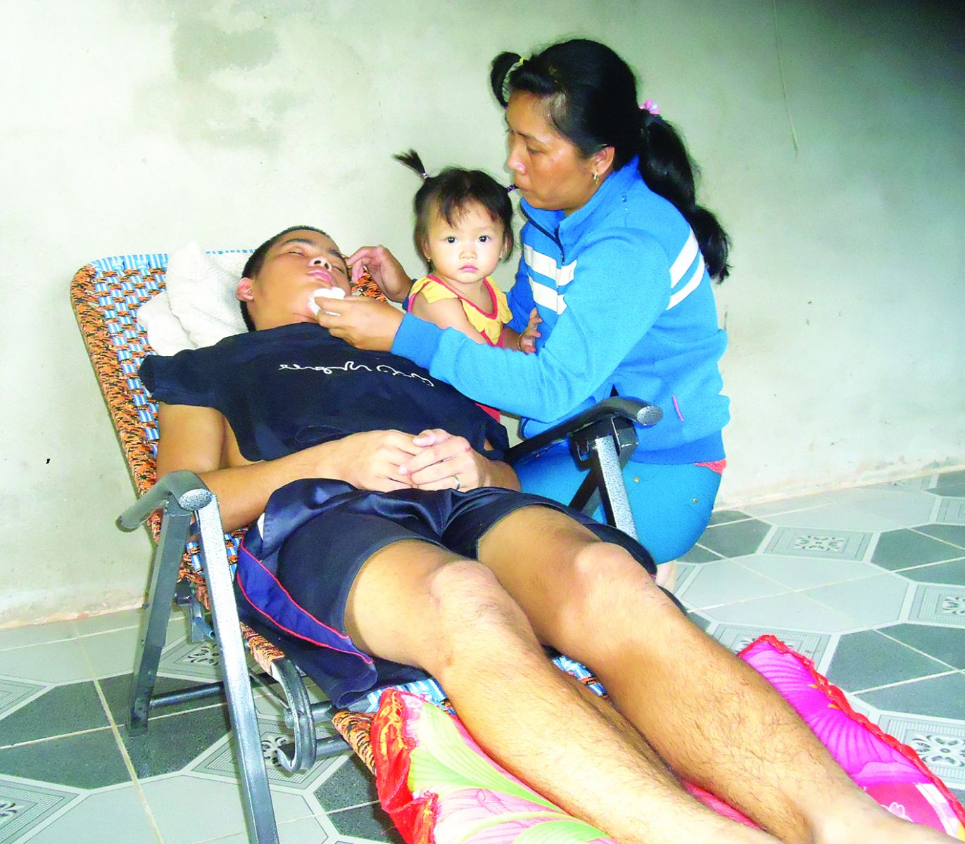 Hơn nửa tháng nay, việc ăn uống, vệ sinh, giặt giũ… của em đều phải nhờ vào đôi bàn tay của mẹ. Nhìn cậu con trai nằm thoi thóp, thở khó nhọc, người mẹ nghèo quay mặt đi lau nước mắt.
