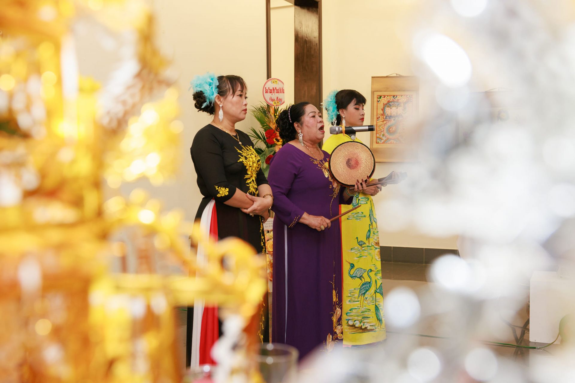Trong đó, cúng bà thì không thể thiếu mâm vàng. Cái mâm vàng được dán bằng giấy vàng, bạc đại; có hình tháp ba tầng tượng trưng cho tam tài Thiên - Địa - Nhơn, cùng với ngụ ý Phước - Lộc - Thọ; tháp mâm vàng trổ ra bốn cửa tượng trưng cho bốn mùa, tám tiết thể hiện cho mong cầu xuân đa kiết khánh, hạ bảo bình an, thu tống tam tai, đông nghinh bá phước; trên tháp mâm vàng được cắt dán các hoa văn tứ linh, hưu đội đồng tiền, chim hoà bình, con dơi, chữ thọ… qua những chi tiết thể hiện trên chiếc mâm vàng cho thấy được những mong cầu, ước nguyện của cư dân về cuộc sống an cư lạc nghiệp, quốc thới dân an, mưa thuận gió hoà...