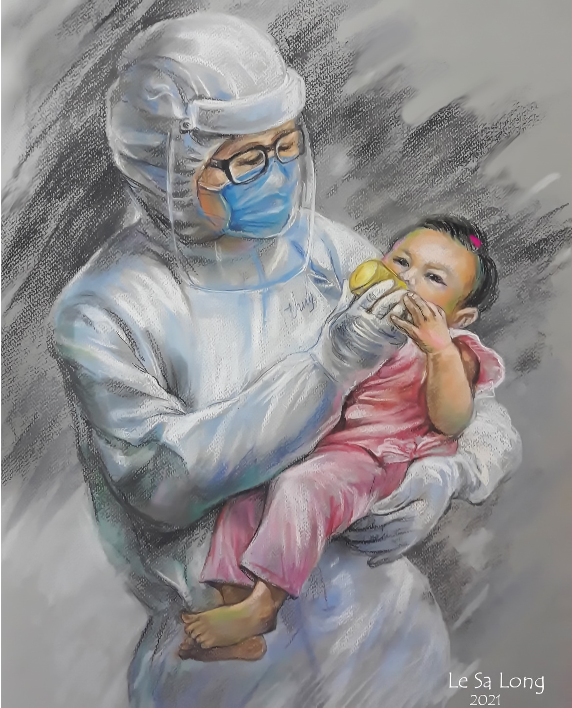 Bác sĩ chăm sóc con của bệnh nhân Covid-19. Tranh của hoạ sĩ Lê Sa Long
