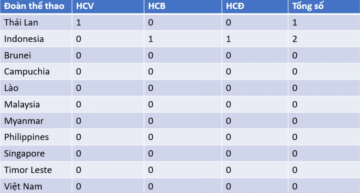 Các đoàn còn lại trong khu vực gồm Brunei, Campuchia, Malaysia, Lào, Myanmar, Timor Leste, Philippines, Singapore và Việt Nam đều chưa giành được huy chương nào.