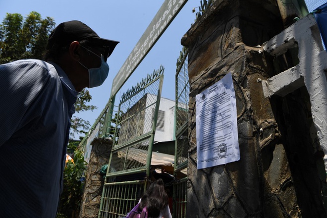 Người dân thủ đô Phnom Penh đọc thông báo tạm đóng cửa một trường tiểu học vì tình hình dịch Covid-19 ngày 14/3. Ảnh: AFP.