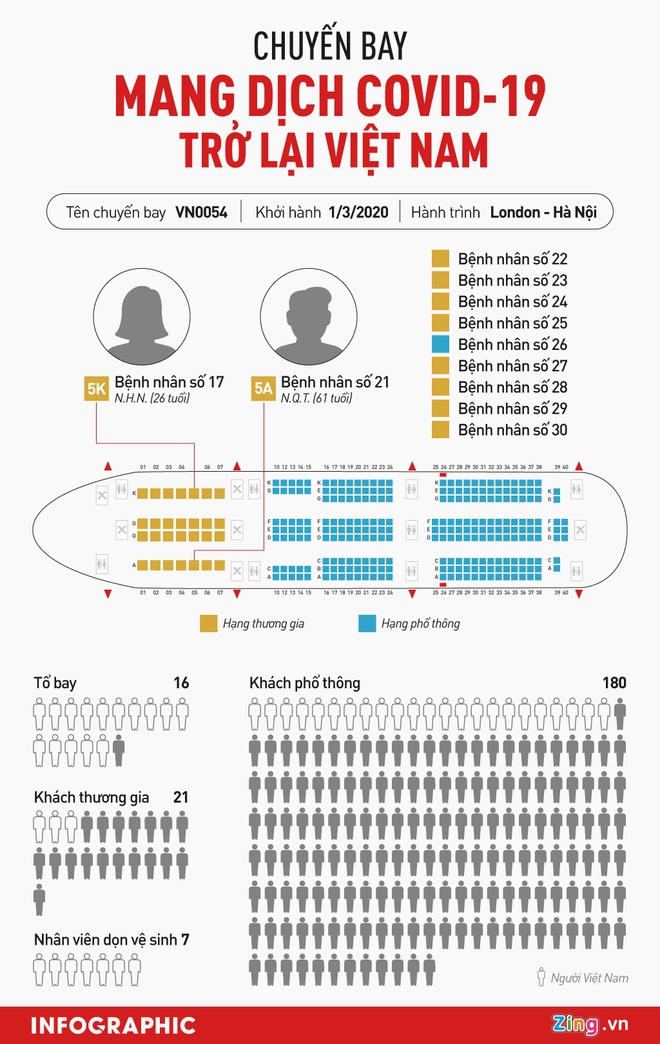 Ngày 26/2, bệnh nhân quay lại London. Ngày 29/2, cô có biểu hiện ho nhưng không đi khám, hôm sau xuất hiện thêm triệu chứng đau mỏi người. Trong ngày 1/3, bệnh nhân đáp chuyến bay VN0054 của Vietnam Airlines từ London về Nội Bài lúc 4h30 ngày 2/3 (lúc này bệnh nhân không sốt).