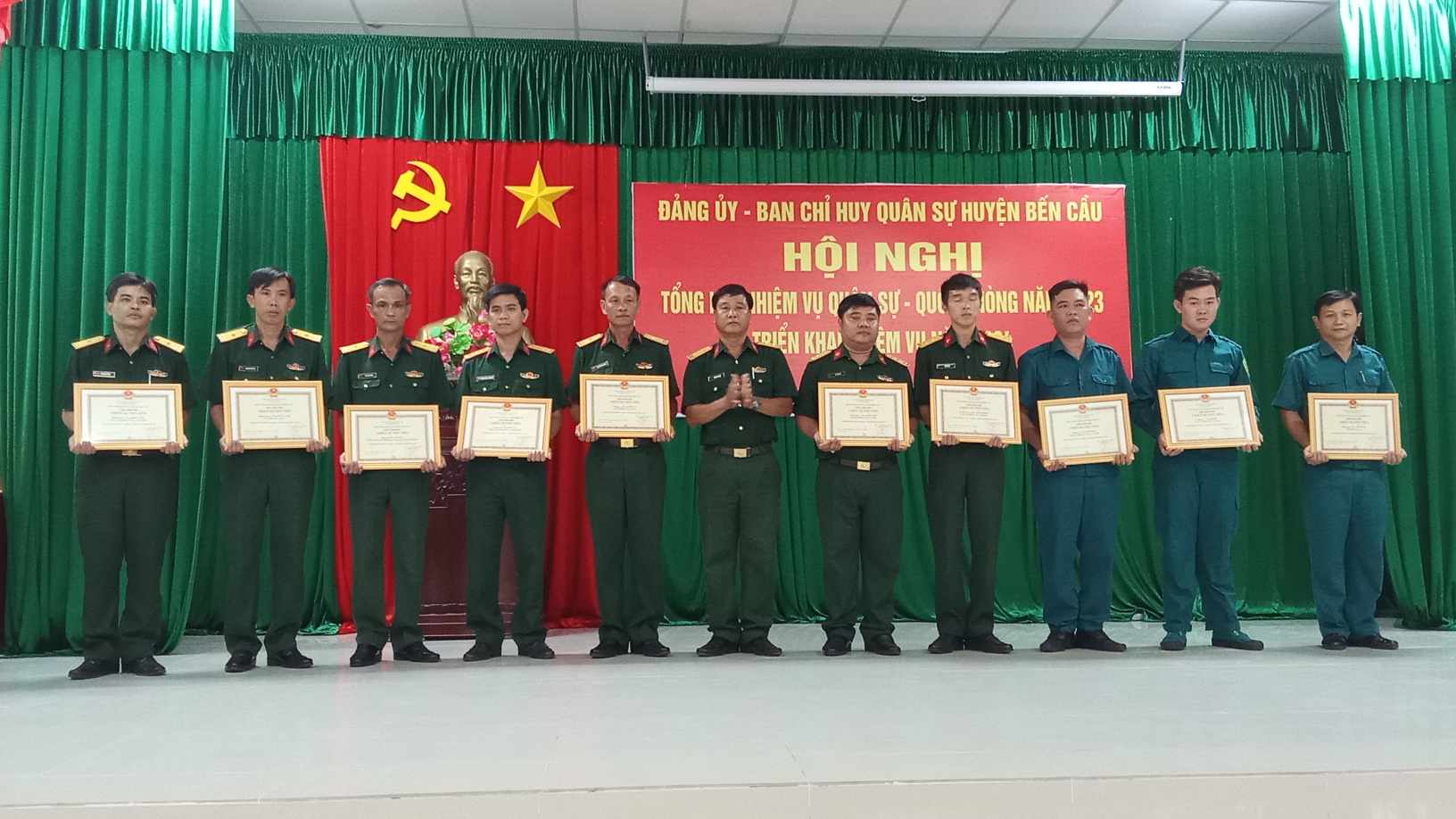 * Năm 2023, LLVT huyện Bến Cầu thực hiện tốt công tác tham mưu cho Huyện uỷ - UBND huyện trong lãnh đạo, chỉ đạo và hoàn thành tốt nhiệm vụ quân sự-quốc phòng địa phương. Công tác tuyển quân đạt 100% chỉ tiêu 2 cấp; diễn tập chiến đấu trong khu vực phòng thủ tại các xã Long Chữ và Lợi Thuận đạt mục đích, yêu cầu đề ra; duy trì nghiêm chế độ trực sẵn sàng chiến đấu; tích cực phối hợp Công an, Biên phòng và các lực lượng chức năng khác bảo đảm tình hình an ninh chính trị, trật tự ATXH trên địa bàn huyện.