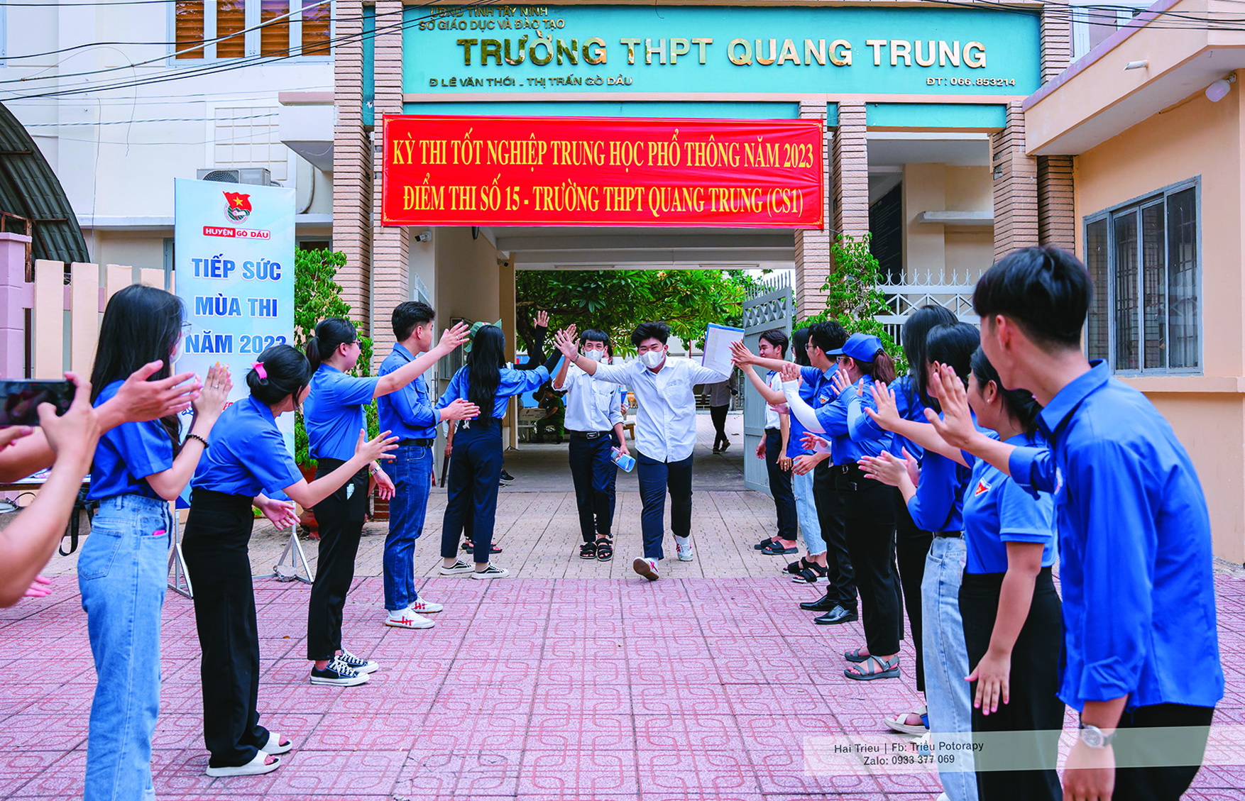 Thí sinh ùa ra cổng trường thi dưới sự cổ vũ của các tình nguyện viên tiếp sức mùa thi
