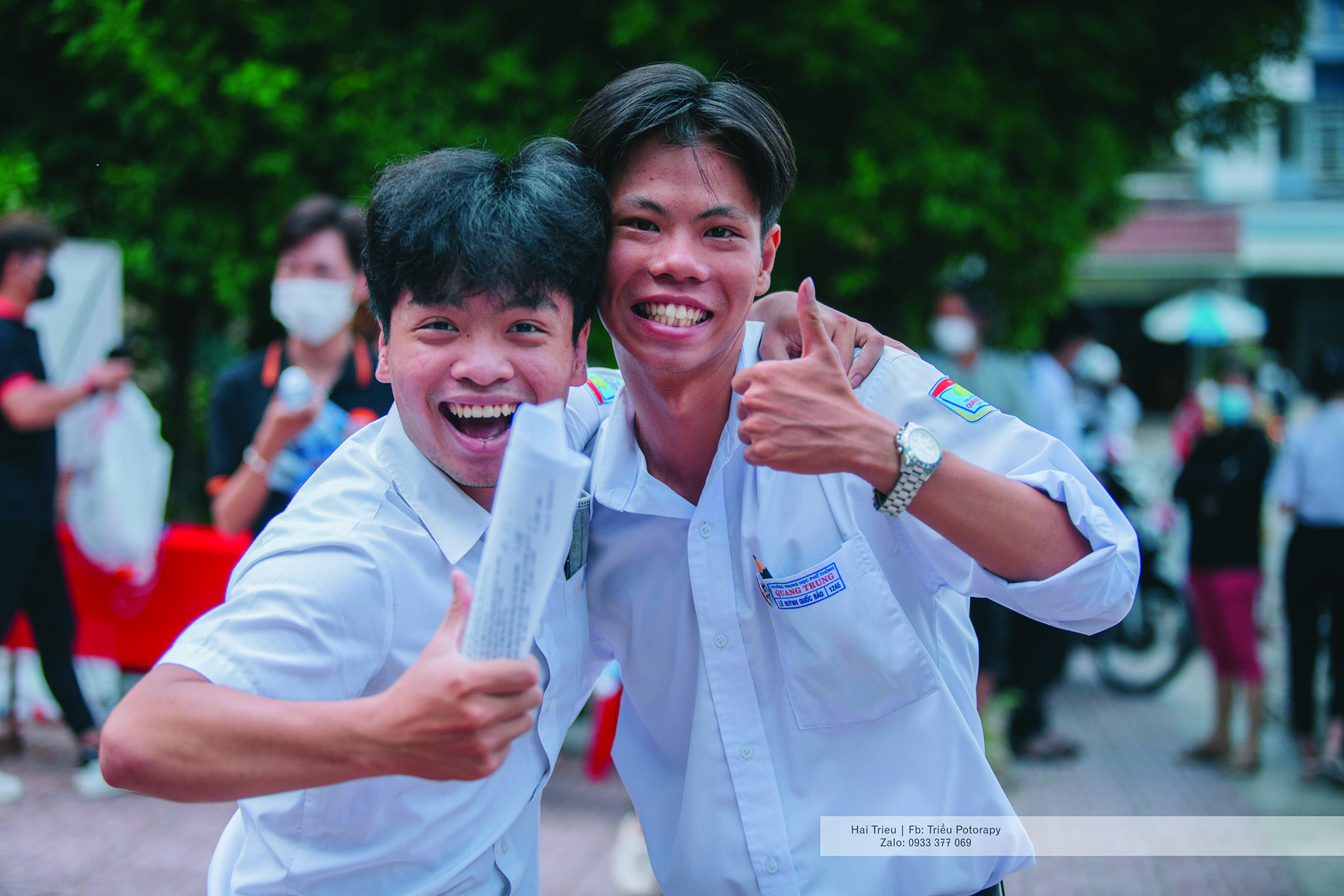 Hai thí sinh chia sẽ niềm vui hoàn thành tốt bài thi