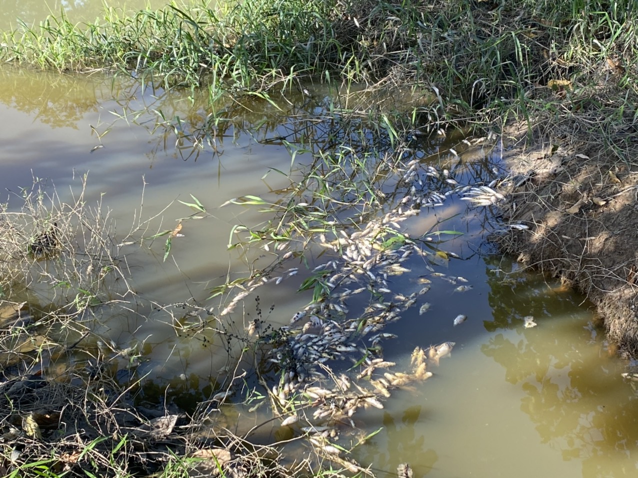 Các nhánh mương theo bờ rạch cá chết dạt vào nổi trắng mặt nước.