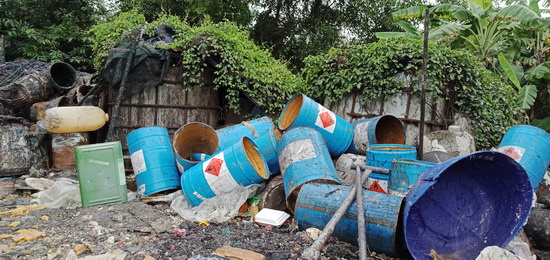 Các thùng đựng hóa chất và phế phẩm từ việc chưng cất được xả lênh láng tại chỗ trên mặt đất, không có tường rào bao quanh. Đáng lo ngại, bãi rác đang đề cập lại nằm giáp với một con suối chảy thẳng ra sông Sài Gòn. Mỗi khi trời mưa, nước từ bãi rác chảy dồn xuống suối. Thỉnh thoảng, có người đốt rác và hóa chất phế phẩm, lửa cháy bốc lên làn khói đen cuồn cuộn bay xa trong gió.