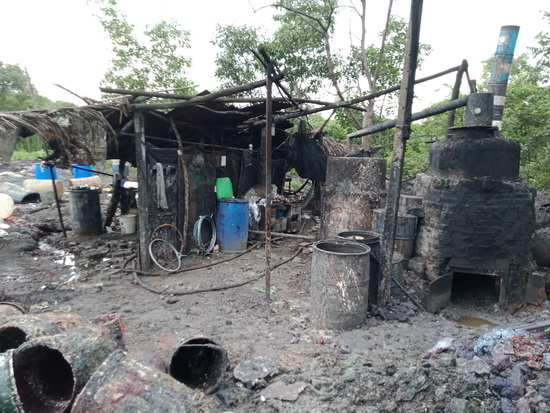 Cuối bãi rác, tại vị trí gần giáp suối là một lán trại che cất tạm bợ để hoạt động đun nấu và chưng cất hóa chất. Tại đó có lò nung hình tháp trụ được xây bằng gạch, trên lò đặt một bồn kim loại dùng để chứa hóa chất cần đun sôi, kế bên là ống cống chứa nước làm mát, kiểu như quy trình chưng cất rượu. Phế phẩm từ việc chưng cất khá dẻo (chất còn lại trong bồn kim loại), nhiều màu sắc, được đổ thành đống cao và chảy tràn xuống gần tới bờ suối.