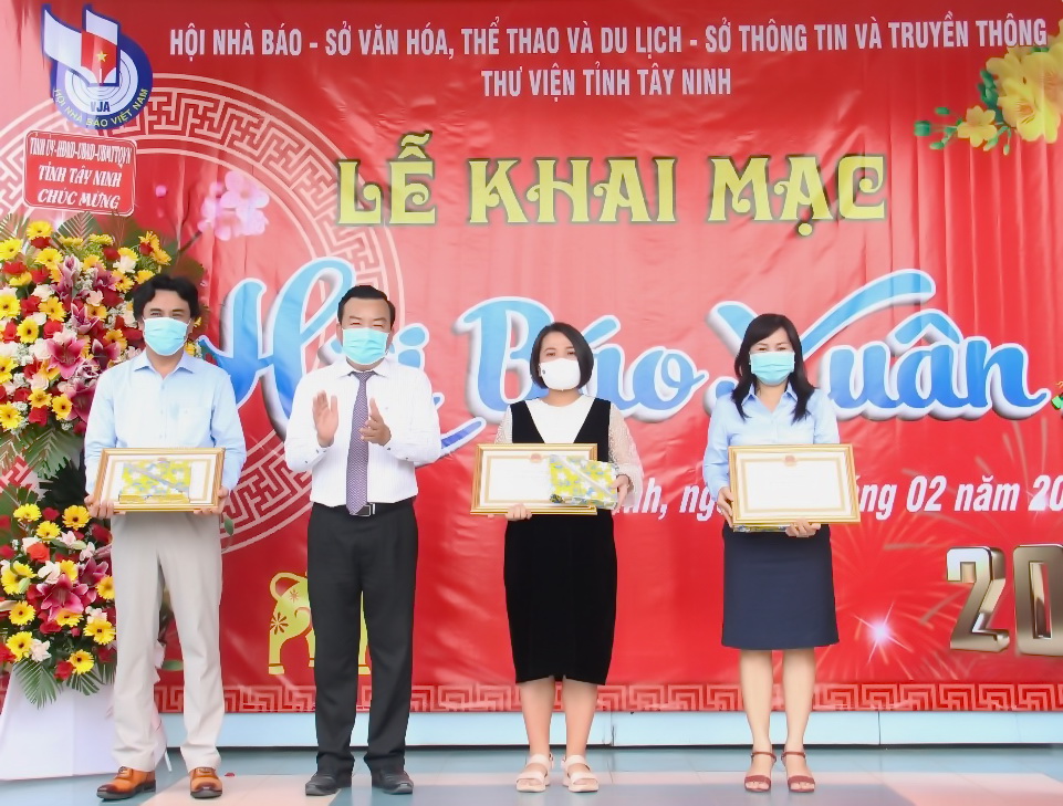 Ông Phạm Hùng Thái - Phó Bí thư Thường trực Tỉnh uỷ (thứ hai từ trái sang) chúc mừng 3 nhà báo được tặng bằng khen của UBND tỉnh tại Hội Báo xuân năm 2021. Ảnh: XV