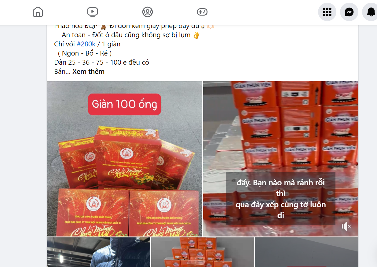 Một tài khoản facebook H. đăng tải một số hình ảnh, thông tin video quảng cáo về các loại pháo. Chủ tài khoản để số điện thoại trên dòng trạng thái, đăng tải nhiều hình ảnh giao dịch mua bán pháo hoa để người có nhu cầu mua pháo liên lạc. Thậm chí, để tăng niềm tin, người này còn đăng nhiều ảnh quảng cáo có băng-rôn ghi dòng chữ “Cửa hàng pháo hoa số 25”, điểm trưng bày và giới thiệu sản phẩm pháo hoa.