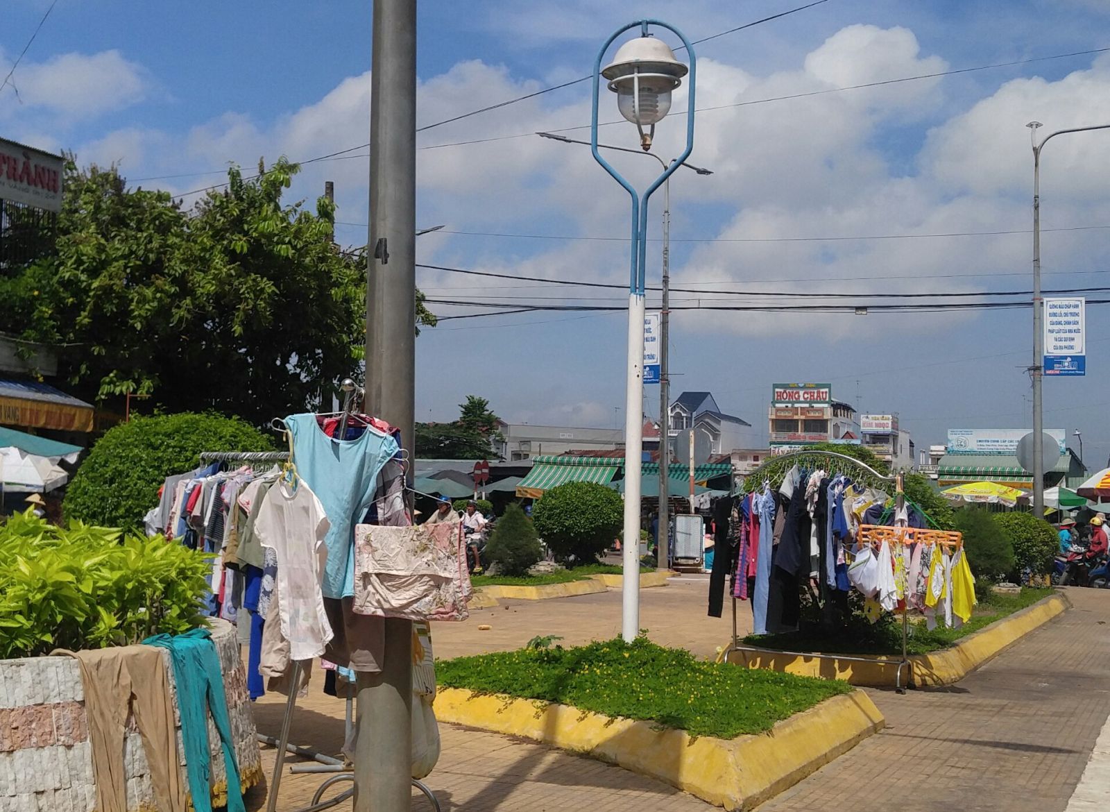 Mới đây, ngày 10.5, tại khu vực cửa số 7 chợ Long Hoa còn xuất hiện hình ảnh hết sức phản cảm. Ðó là việc “ai đó” đã mang cả quần áo ra phơi trên dải phân cách có trồng hoa kiểng trên đường.