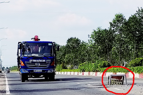 Người dân lấy bàn nhựa chắn ổ gà trên đường 786, đoạn qua ấp Thuận Tây, xã Lợi Thuận, huyện Bến Cầu để cảnh báo cho người đi đường.