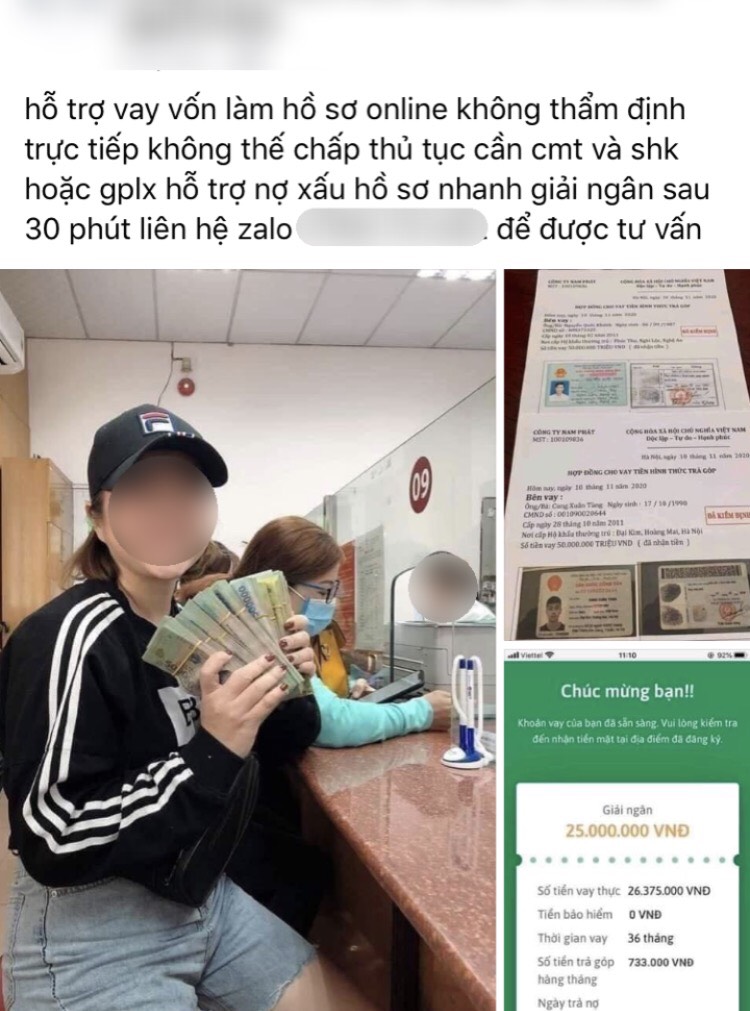 Trước đó, ông V.V.Đ (ngụ huyện Châu Thành) cho biết, từng bị người khác tạo tài khoản Facebook có tên, hình ảnh gia đình ông để kết bạn với họ hàng, người quen. Sau đó, kẻ xấu đã đăng bài có nội dung: hỗ trợ làm hồ sơ vay vốn không thẩm định, không thế chấp. Thủ tục cần CMND, sổ hộ khẩu hoặc giấy phép lái xe. Hỗ trợ tất cả các nợ xấu, hồ sơ nhanh, giải ngân sau 30 phút, kèm theo số điện thoại để liên hệ.