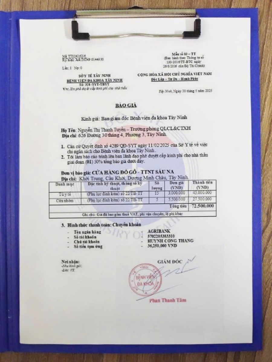 Giám đốc BVĐK tỉnh cung cấp cho chúng tôi xem bản báo giá giả danh bệnh viện. Trong đó, có những nội dung như người đứng tên là Nguyễn Thị Thanh Tuyền- Trưởng Phòng Quản lý chất lượng và Công tác xã hội (QLCL&CTXH); địa chỉ 626, đường 30 tháng 4, phường 3, Tây Ninh. Đơn vị báo giá: Cửa hàng đồ gỗ - TTNT Sáu Na; địa chỉ: Khởi Trung, Cầu Khởi, Dương Minh Châu.